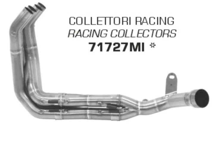 The 71727MI Racing Collectors for the Kawasaki Z 900 (2021-2024) are designed for high-performance applications. Constructed from stainless steel, these racing collectors are built for durability and optimal exhaust flow. They feature a welded mount for secure attachment. The junction outlet diameter is 62 mm, while the inlet diameter and silencer body length are not applicable as this is a header system. Equipped with an oxygen sensor plug but lacking a CO sensor plug and dB killer, these collectors weigh 4.1 kg, making them a robust addition to enhance the bike's exhaust performance.