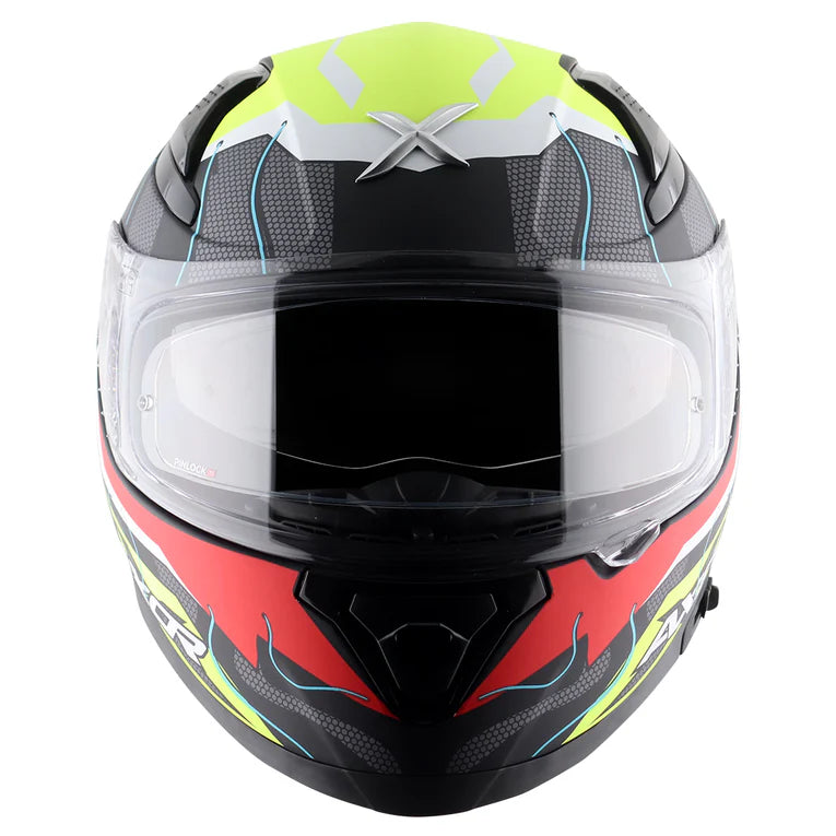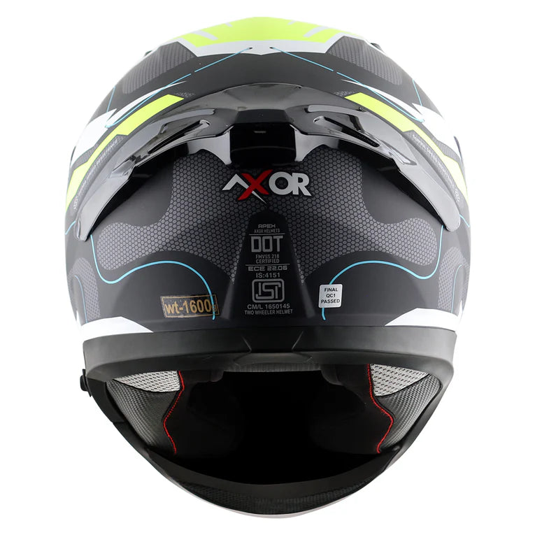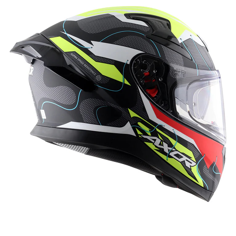 Axor introduces the dynamic Apex Dynamo helmet model, designed to embody and enhance your adventurous spirit. With its striking graphics and vibrant color schemes, the Apex Dynamo is tailored for passionate riders, seamlessly blending style with comfort. Engineered to optimize airflow, the helmet features strategically positioned intake and outlet vents along with a spoiler-integrated back vent for superior ventilation. Its visor system ensures clarity with an optically correct visor and a tool-less mechanism for quick changes, complemented by an internal sun visor. Safety is paramount, demonstrated by the dual EPS liner that conforms snugly to the head to absorb impact energy, coupled with a secure Double D-ring lock system. Crafted from ABS material, the helmet offers robust protection at a weight of 1600±50 grams. It meets rigorous safety standards including ECE R-22.06, DOT FMVSS NO. 218, and ISI certification, undergoing extensive testing across various conditions to ensure reliability in all environments.