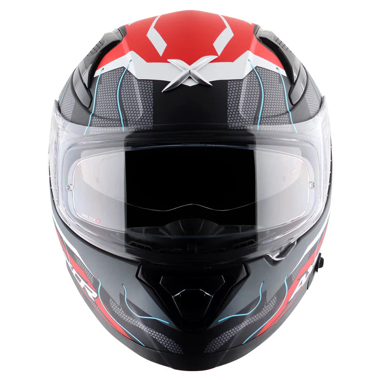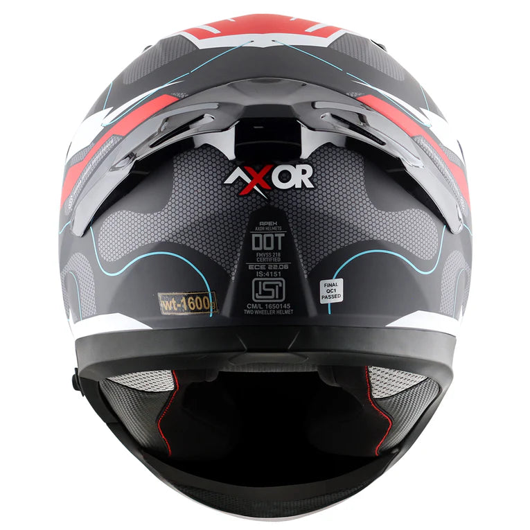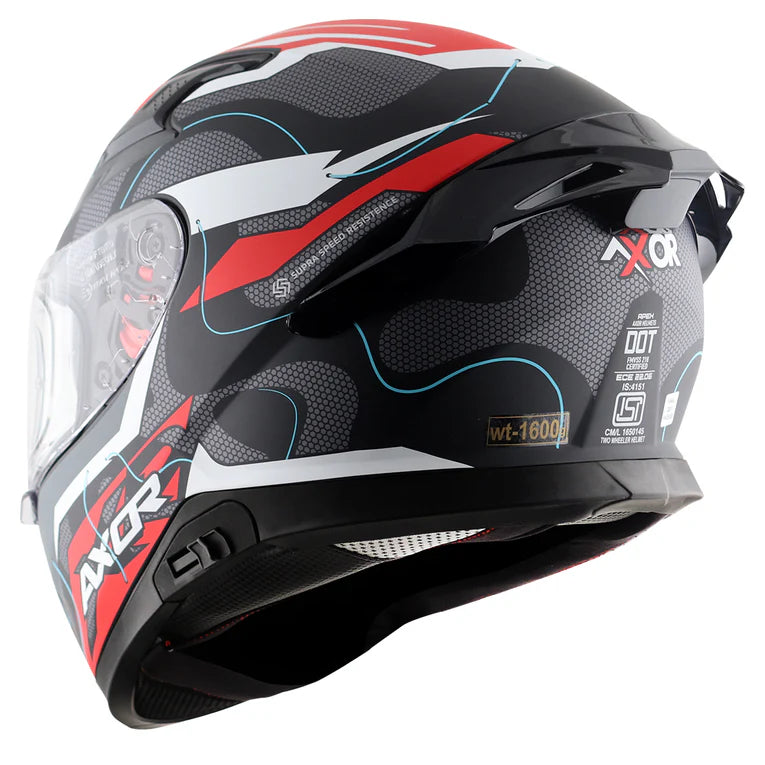 Axor introduces the dynamic Apex Dynamo helmet model, designed to embody and enhance your adventurous spirit. With its striking graphics and vibrant color schemes, the Apex Dynamo is tailored for passionate riders, seamlessly blending style with comfort. Engineered to optimize airflow, the helmet features strategically positioned intake and outlet vents along with a spoiler-integrated back vent for superior ventilation. Its visor system ensures clarity with an optically correct visor and a tool-less mechanism for quick changes, complemented by an internal sun visor. Safety is paramount, demonstrated by the dual EPS liner that conforms snugly to the head to absorb impact energy, coupled with a secure Double D-ring lock system. Crafted from ABS material, the helmet offers robust protection at a weight of 1600±50 grams. It meets rigorous safety standards including ECE R-22.06, DOT FMVSS NO. 218, and ISI certification, undergoing extensive testing across various conditions to ensure reliability in all environments.
