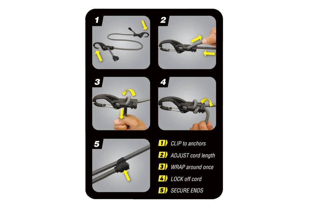 Take our KnotBone Adjustable Bungee, for instance. Equipped with carabiner clips rather than open hooks at each end, it not only attaches to anchor points but also locks onto them. Unlike elastic materials that lose their stretch over time, the KnotBone Bungee features a robust, high-quality cord that threads through each end, offering adjustment from 121.9cm to 25cm (48" to 10") in the #9 size and from (28" to 6") in the #5 size. Once adjusted to the desired length, it can be securely locked in place with a simple wrap-and-lock motion. Additionally, small self-clipping plastic caps have been added to the cord ends to ensure they stay in place once the load is secured. No more struggling with pulling, stretching, and re-hooking to achieve the desired tension—job after job, the KnotBone Bungee remains securely attached, pulls precisely to the required length, and stays locked in position.