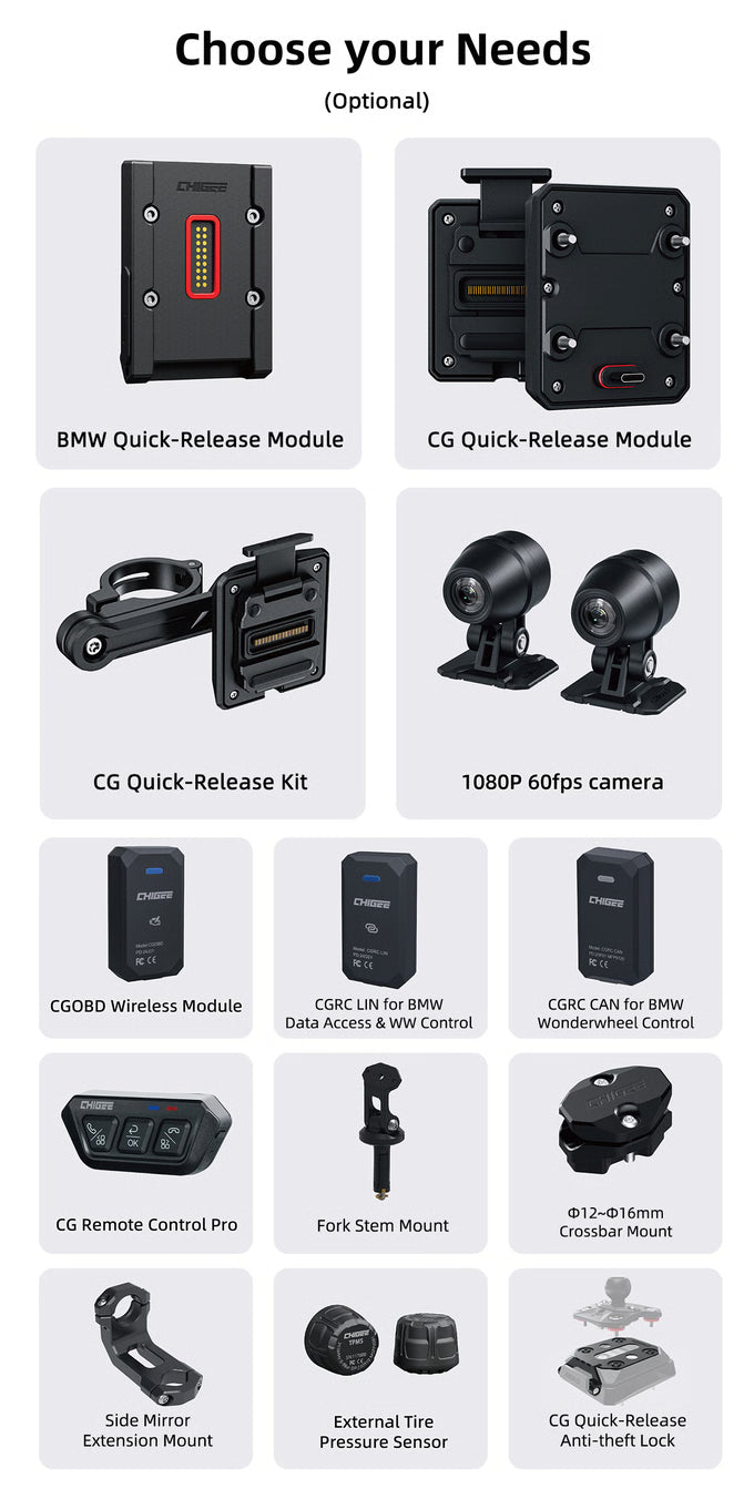 The AIO-6 Max features a 6-inch ultra-bright 2000-nit display with automotive-grade dual-backlight technology for exceptional visibility in any riding condition. Powered by a high-performance A53 dual-core processor and CHIGEE OS 2, it delivers smooth, fast, and reliable operation on every ride. With customizable accessories—including quick-release modules, cameras, and additional add-ons—you can build a setup that perfectly matches your motorcycle and riding style.