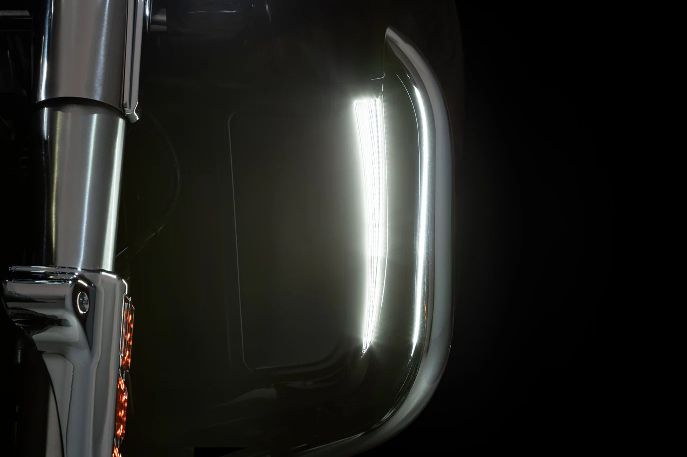 Illuminate your bike's front with powerful white LED light using Fang® Lower Fairing Lights. They provide wide illumination for dark areas and low-speed maneuvering, with added amber turn signals for enhanced visibility. Featuring GHOST™ Lens Technology, these lights ensure unmatched brightness and visibility day or night.