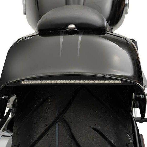 Upgrade your Harley-Davidson® Softail Breakout with our sleek and functional integrated third brake light. This durable aluminum housing replaces the OEM rear fender reflector (OEM Part 67900165), featuring 60 dual-intensity red LEDs. The design includes a single row of flush-mounted lights that serve as a dim running light, a bright brake light, and split turn signals for both left and right sides.