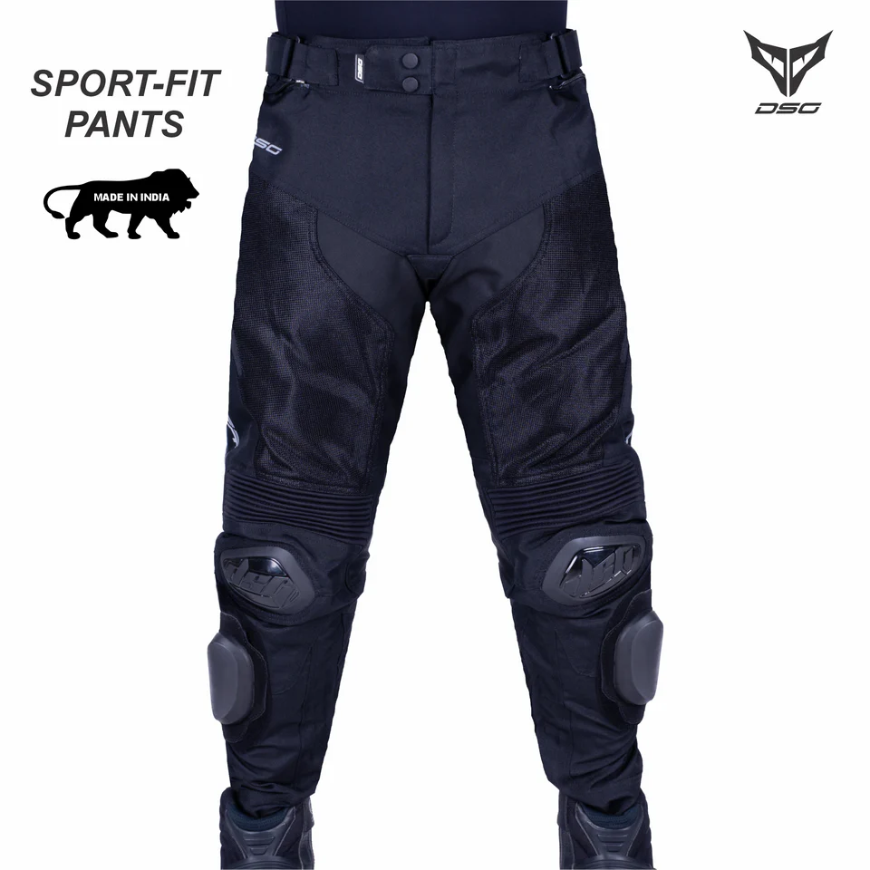 DSG Race Pro V2 Motorcycle Pants who need ventilation, protection, and performance in one sleek package. Crafted from durable 900D poly-fabric with high-abrasion 3D mesh panels, they offer excellent airflow for hot-weather rides. Stretch zones at the knees, waist, and calves ensure flexibility and comfort in an aggressive riding position. CE Level 2 DSG FLEXEON protectors at the hips and knees provide high-level impact protection, while TPU knee sliders and removable external sliders add a track-ready edge. Pre-curved legs improve fit and riding comfort, and reflective detailing enhances visibility in low-light conditions. Functional front pockets add everyday practicality. Pair these pants with the DSG Race Pro V2 Jacket for a complete, performance-driven ridin **DSG Race Pro V2 Motorcycle Pants – Cool, Comfortable, and Track-Ready** The DSG Race Pro V2 Pants are built for riderg setup that keeps you cool and protected.