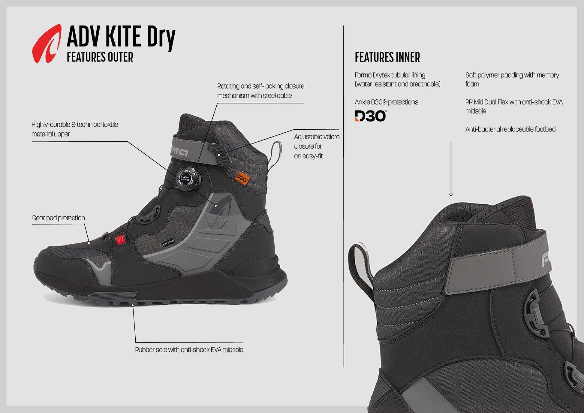 The ADV Kite Dry is a water-resistant boot designed for the town and the hill. The perfect crossover in case you combine city riding with adventures in the great outdoors. Super grip, even when you are outdoor and maximum comfort whether you are in the street or on a hill.