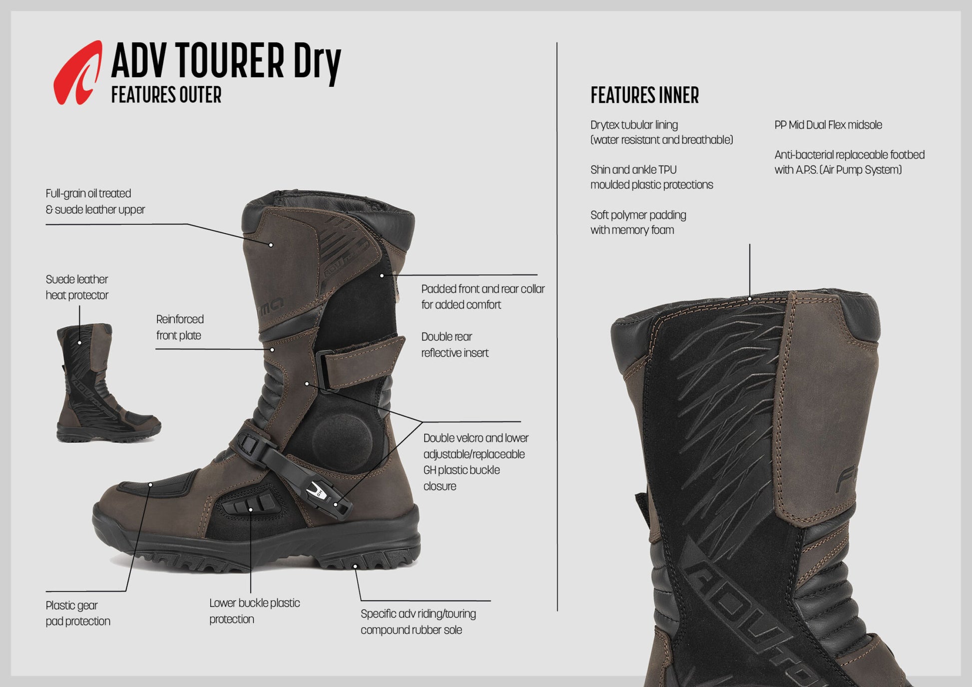 Designed specifically for touring riders who just can not seem to help themselves from finding out where that lone dirt road meanders off to. These boots ensure you are protected enough to tackle whatever you next adventure throws at you. The water resistant and breathable Forma Drytex tubular lining keeps water out on the wettest days.