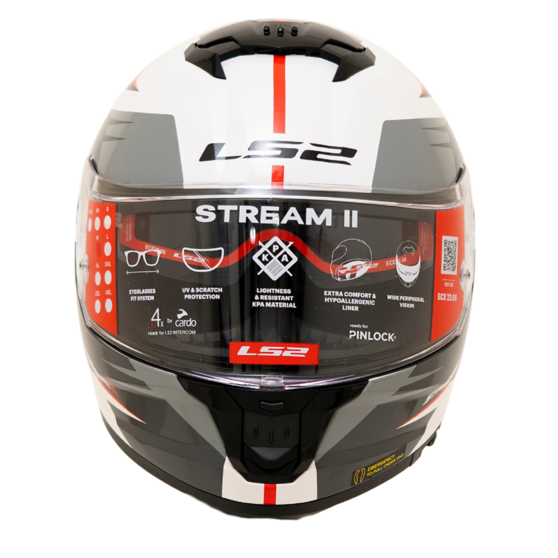 The LS2 Stream II is built using Kinetic Polymer Alloy (KPA), a lightweight yet high-strength material combining advanced polymers and aramid fibers, weighing approximately 1550 grams (±50g). It meets both ECE 22.06 and DOT FMVSS safety standards, featuring a multi-density EPS liner for superior impact protection and LS2’s Advanced Rotational Energy Management (AREM) system to mitigate rotational forces. The helmet includes a Class A polycarbonate visor that is optically correct and Pinlock-ready for fog resistance, along with an integrated drop-down sun visor. Its dynamic flow-through ventilation system includes adjustable intake ports and exhaust vents to maintain airflow. The interior features removable and washable hypoallergenic liners, 3D laser-cut foam cheek pads, and an intermediate oval fit, with compatibility for prescription glasses and Bluetooth intercom systems. It secures with a quick-release chin strap and is available in sizes ranging from XXS to 3XL.