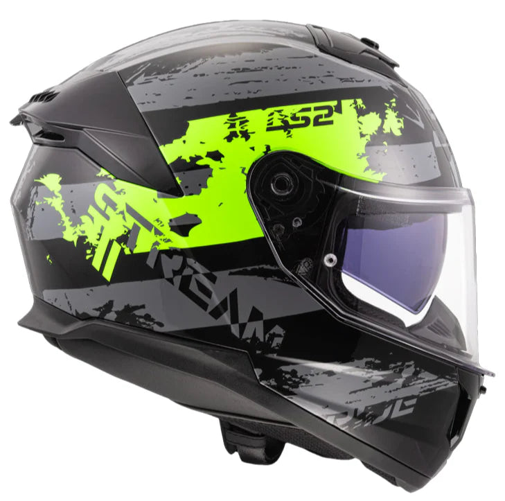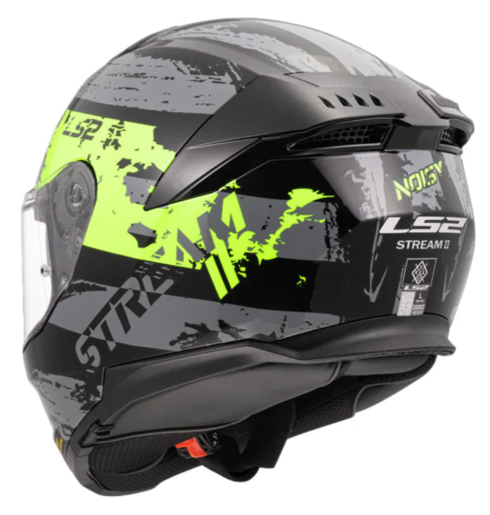 The LS2 Stream II is a full-face motorcycle helmet that seamlessly blends advanced safety features with modern design, making it an ideal choice for riders seeking both performance and comfort. Constructed from LS2’s proprietary Kinetic Polymer Alloy (KPA), the helmet boasts a lightweight yet robust shell, weighing approximately 1550 grams (±50g). This material integrates microscopic aramid fibers with high-end polymers, enhancing energy absorption and impact resistance without the ricochet effect associated with inferior materials. The helmet's aerodynamic design is complemented by a rear spoiler, ensuring dynamic flow-through ventilation to keep riders cool and comfortable.