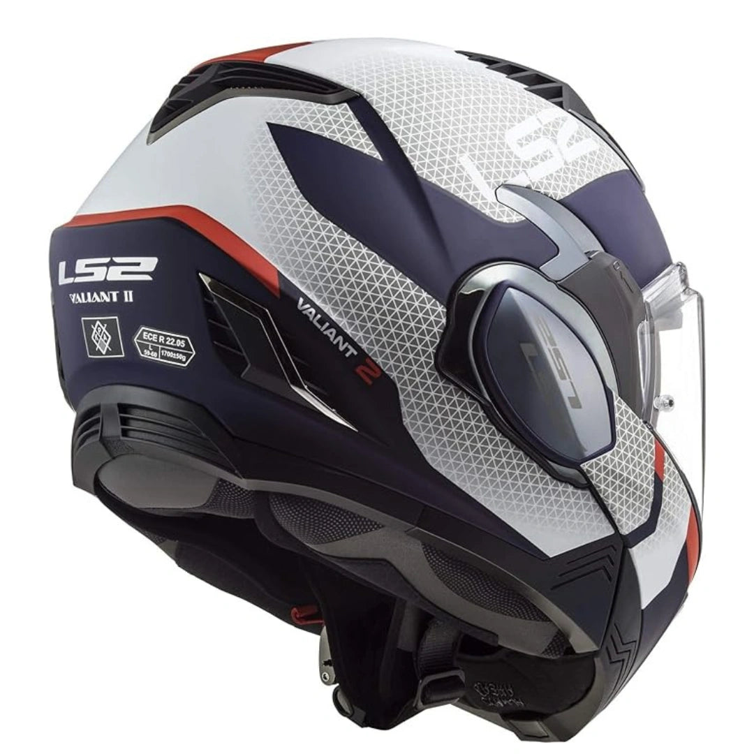 The LS2 Valiant II flip-front motorcycle helmet takes innovation to the next level, following the success of its predecessor. LS2 has refined its technology with a redesigned chin bar mechanism, now smaller and sleeker for enhanced aerodynamics. While maintaining the original Valiant's features, the Valiant II boasts a modernized appearance.