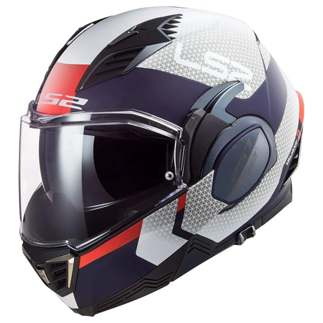 The LS2 Valiant II flip-front motorcycle helmet features a sleek, aerodynamic design with a smaller chin bar mechanism, constructed from LS2's proprietary Kinetic Polymer Alloy for lightweight, energy-dispersing protection, complemented by a scratch-resistant shield, PinLock compatibility, and adjustable ventilation for optimal comfort and control in various riding conditions.