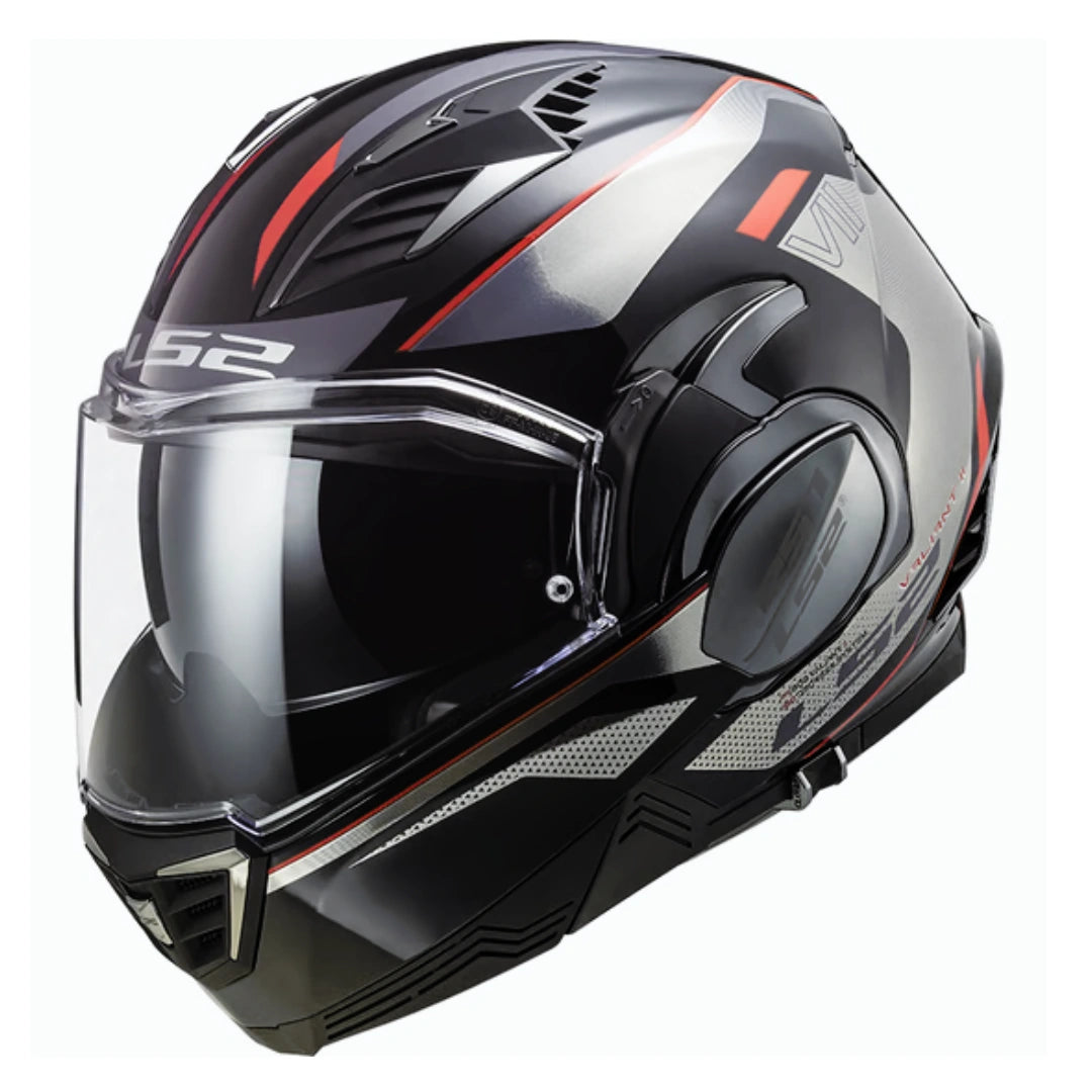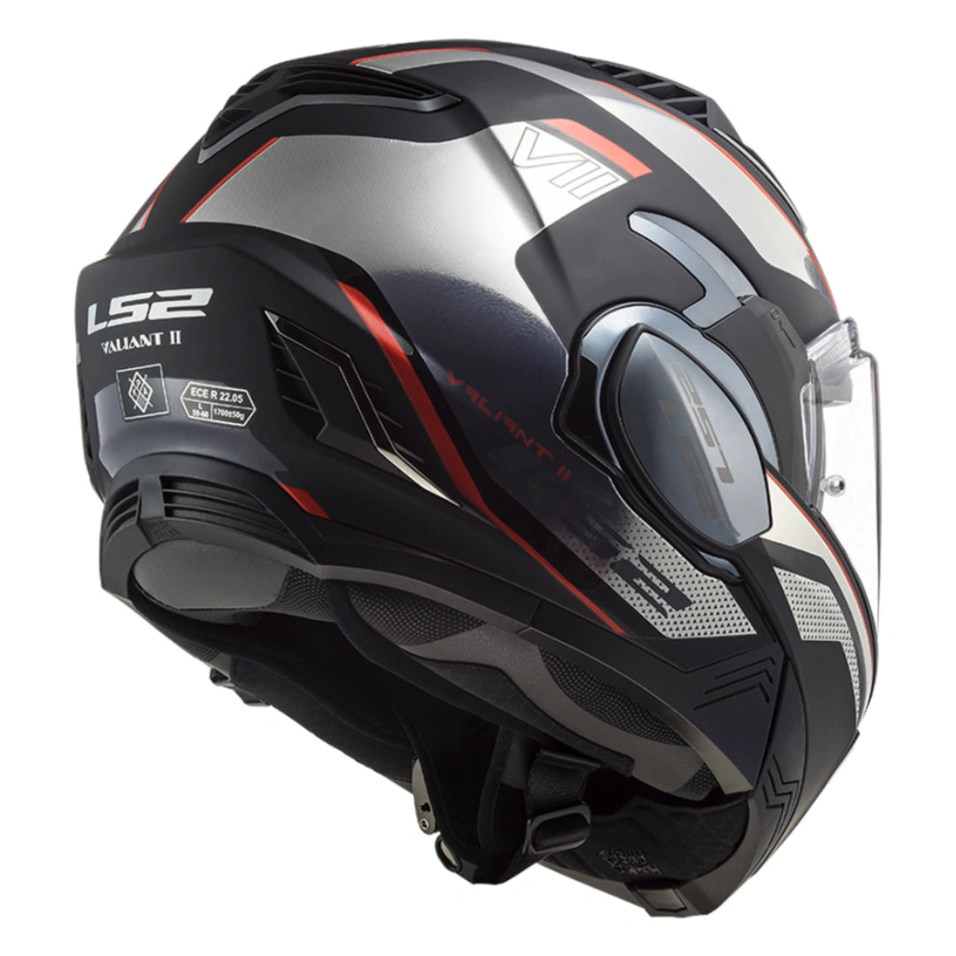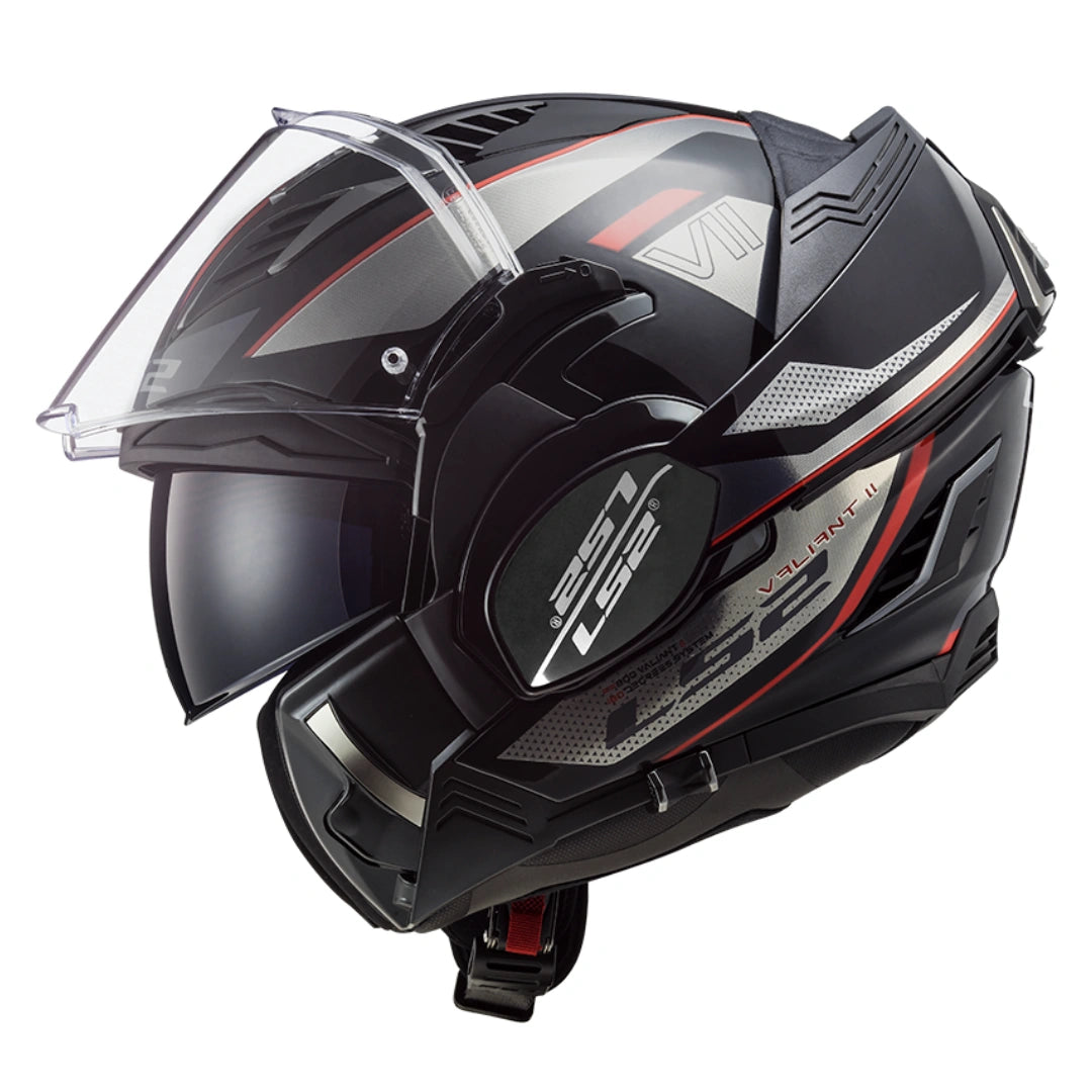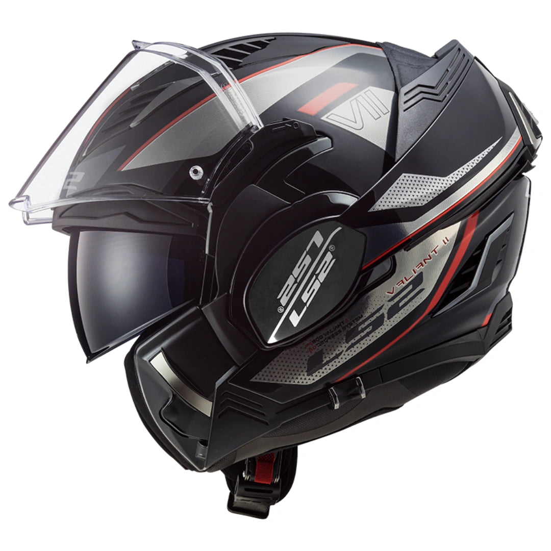 The LS2 Valiant II flip-front motorcycle helmet features a sleek, aerodynamic design with a smaller chin bar mechanism, constructed from LS2's proprietary Kinetic Polymer Alloy for lightweight, energy-dispersing protection, complemented by a scratch-resistant shield, PinLock compatibility, and adjustable ventilation for optimal comfort and control in various riding conditions.