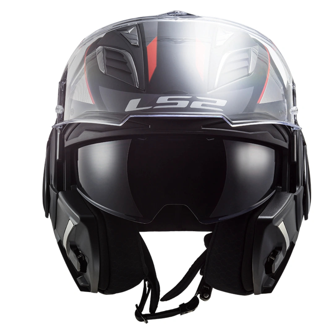 The shield, resistant to UV and scratches, is crafted from optically correct Class A polycarbonate, and is PinLock ready for fog prevention. The Valiant II features LS2's Twin Shield System drop-down sun shield, operated smoothly via a cable switch, even with gloved hands. Its removable padding, crafted from breathable technical fabric and thermo-formed for enhanced breathability, ensures comfort without the need for adhesive layers.