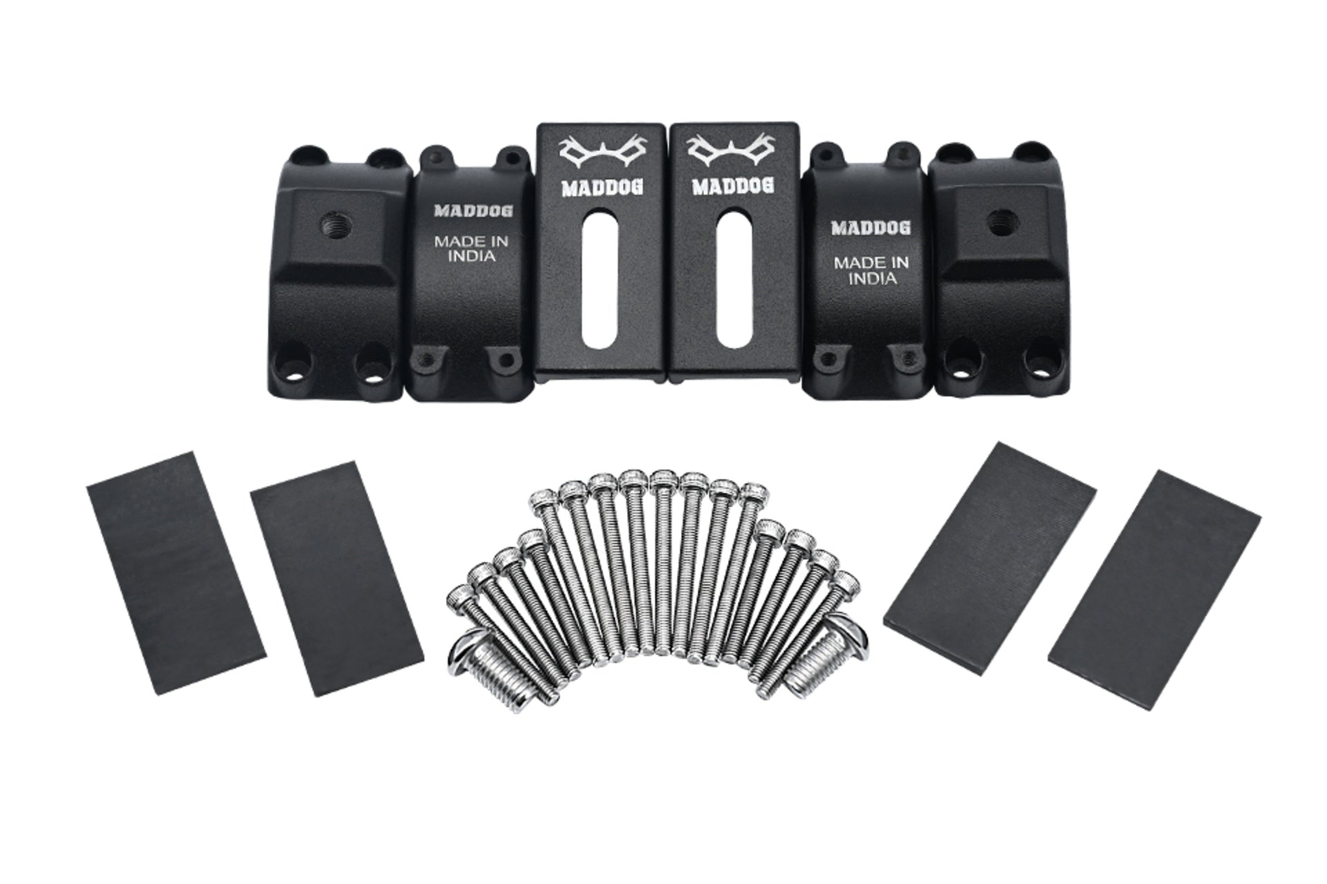 Maddog Light Mounts: Versatile clamps for attaching LED lights to various tubes (20mm-48mm). Rubber padding ensures a secure grip and protects against metal contact. Ideal for adventure bikes, ATVs, and more, with optional rotatable mounting shelf for added versatility and durability.