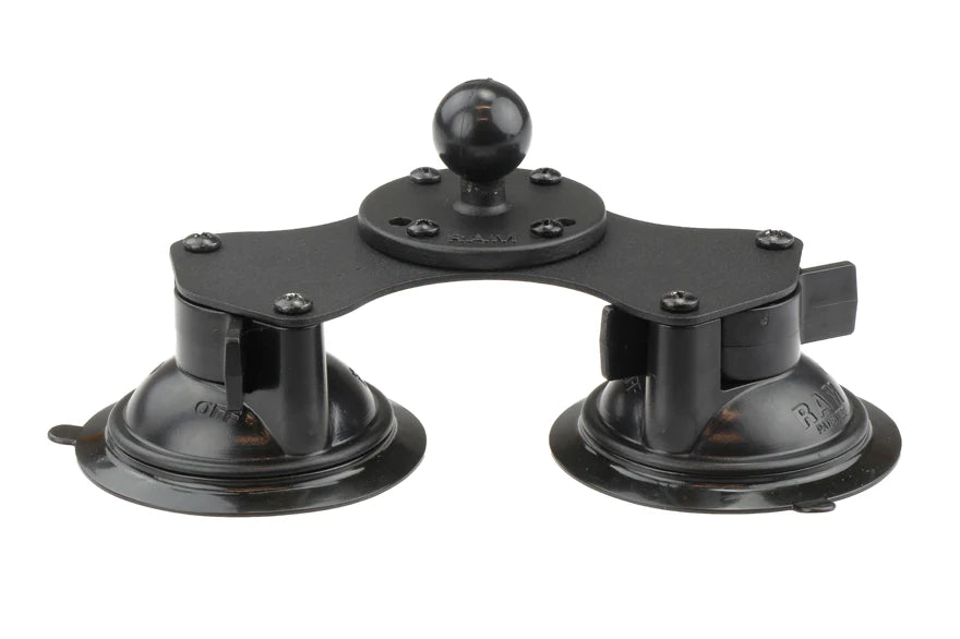 The RAM Base Car - Twist-Lock Dual Suction Cup Base with Ball (RAM-B-189B-202U) provides a dependable mounting solution for your vehicle, featuring two 83.8mm (3.3") twist-lock suction cup bases attached to a powder-coated metal plate. This setup ensures a sturdy connection. Included is a B size 1" ball for versatile attachment options. Designed for a strong grip on smooth, non-porous surfaces, particularly glass or non-porous plastic, the suction cups offer reliable adhesion. Constructed from high-strength composite and powder-coated marine-grade aluminum, this mount is built to withstand the rigors of daily use. Additionally, the included B size 25mm (1") rubber ball allows compatibility with a wide range of RAM mounting components, offering flexibility for various setups and devices.