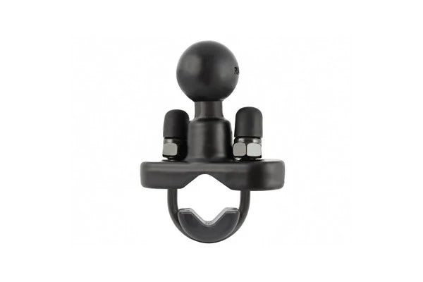 The RAM-B-231ZU features a 25mm (1") rubber ball positioned perpendicular to the mounting rail. Its zinc-coated metal U-bolt is suitable for rails with diameters ranging from 12.7mm to 31.75mm (0.5" to 1.25"). Additionally, the package includes black cover caps to conceal the exposed ends of the U-bolt and a composite adapter that allows for narrowing the rail to a minimum width of 12.7mm (0.5").