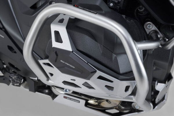 SW-Motech Cylinder Guards for the BMW R 1300 GS are precision-engineered to protect the exposed valve covers of the boxer engine during falls or slides. Featuring a robust combination of a laser-cut aluminum mounting bracket and a CNC-milled anodized aluminum slider pad, these guards are designed to follow the contours of the engine for a seamless fit and reliable coverage.
